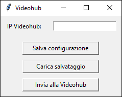 tk.Button(root, text="Invia alla Videohub", width=20, command=send_config).grid(row=3, column=0, columnspan=2, padx=10, pady=10)