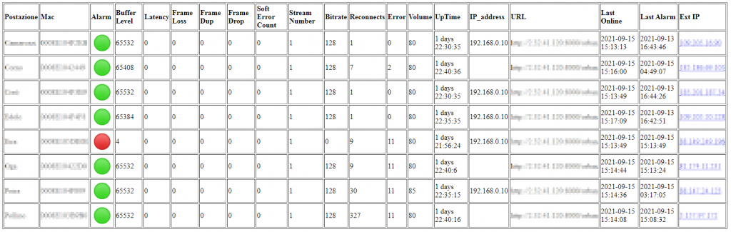 Il file index.php genera una tabella che riassume tutti i valori raccolti dallo script quali numero di errori, tempo di avvio, indirizzo ip, buffer, latenza, etc.