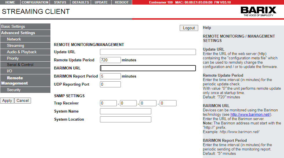Scompattare il file zip in un server web con supporto PHP rispettando la struttura “http://indirizzo.xyz/sensors/data” e recarsi nel pannello di configurazione del Barix che si intende abbinare per inserire l’URL “http://indirizzo.xyz”